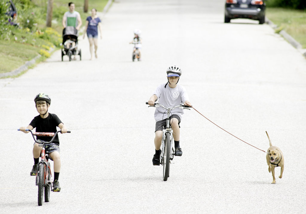 Owen Norton, left, and his brother, Noah, both of Lewiston, take their dog Beckham for a walk in their grandparent’s neighborhood in Auburn on Wednesday. Owen, 7, and Noah, 11, are students at Geiger Elementary School. (Daryn Slover/Sun Journal)