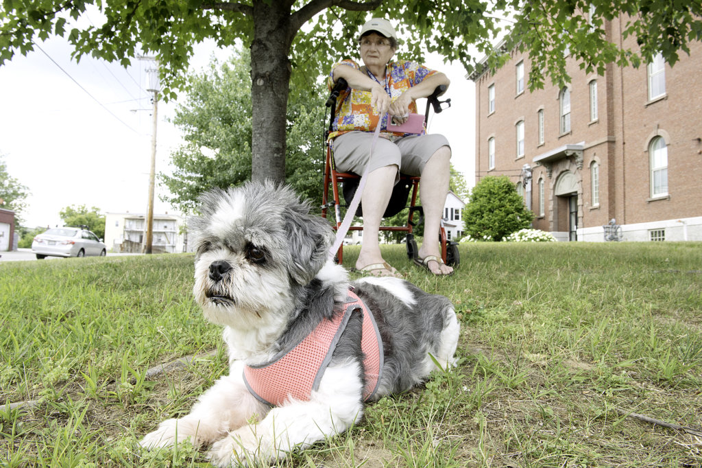 Jackie Bartlett and her 15-year-old Shih Tzu, Pepper, sit in the shade in the hot afternoon Tuesday in Lewiston. “She loves to come out every afternoon and watch the traffic,” Bartlett said about Pepper, who was given to Bartlett 10 years ago. “I would be lost without her.” (Daryn Slover/Sun Journal)