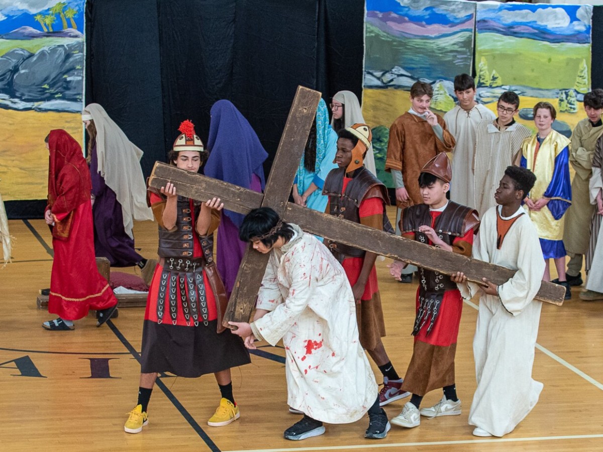 Eighth graders perform the Living Stations of the Cross on Friday morning at the Auburn campus.