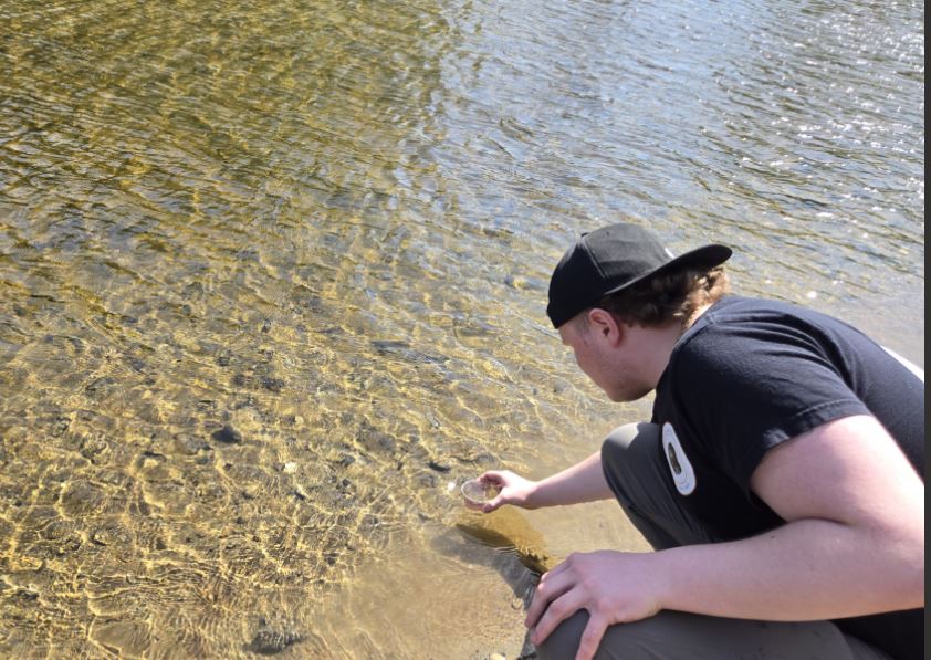 Lawrence High School students release salmon fry into the Sandy River in Farmington