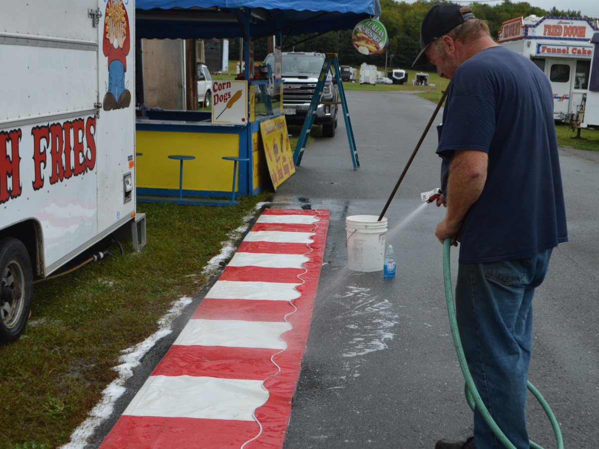 Ben Smith of Skowhegan washes a skirting for Stan McGray’s booth, Stan’s French Fries, ahead of Sunday’s opening day of the fair.