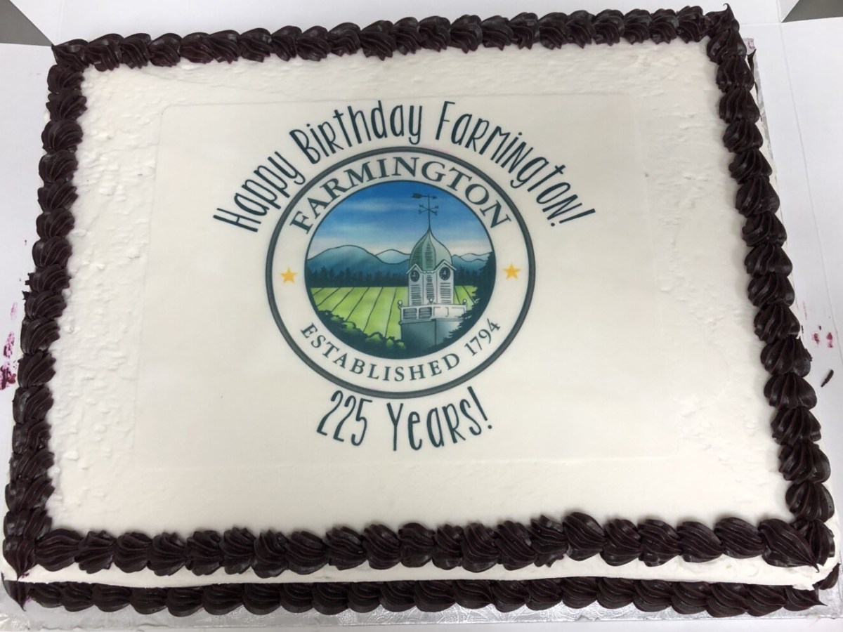 Farmington Historical Society celebrated the towns’ 225th birthday at the North Church on Monday night. About thirty members attended the potluck dinner, played period party games and enjoyed birthday cake.