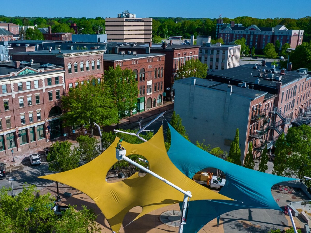 The awnings at Festival Plaza go up for possibly the last time ahead of a redesign in the coming year.