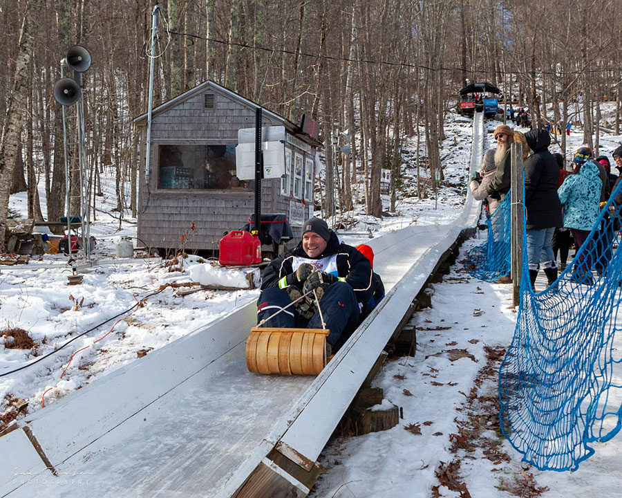 What are the winning times at the National Toboggan Championships in Camden?