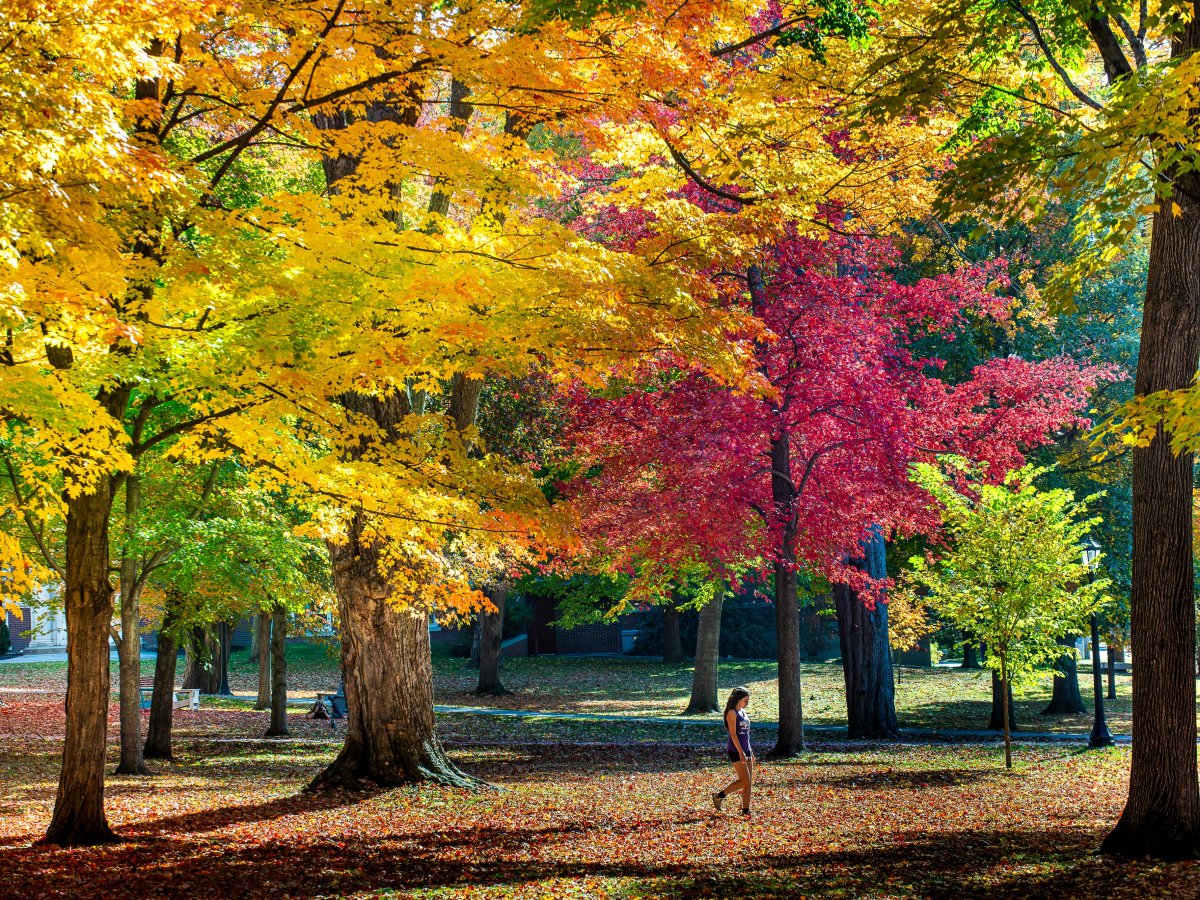 A Bates College student walks through the colorful campus quad Monday morning in Lewiston.