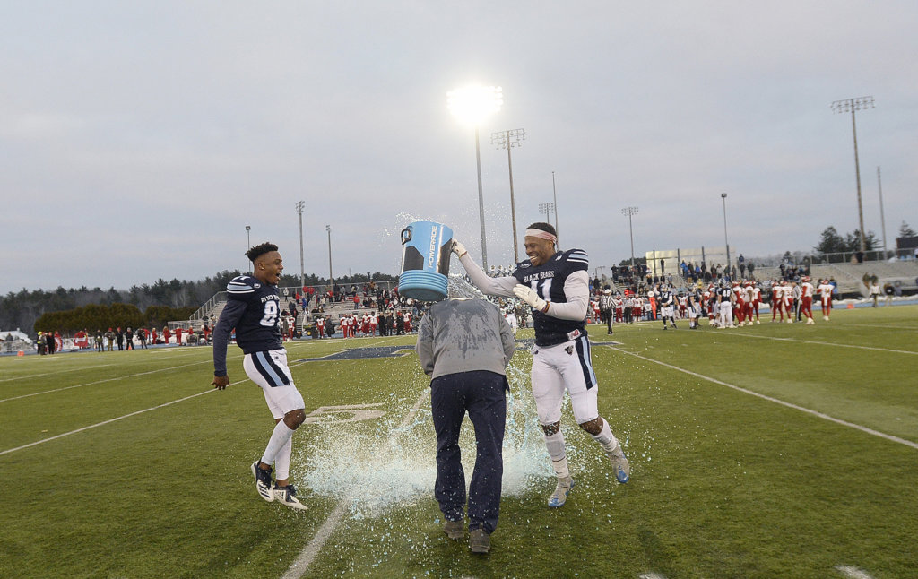 Maine’s Earnest Edwards, left, and Jaquan Blair give coach Joe Harasymiak a Gatorade shower as the clock runs out in the Black Bears’ win over Jacksonville State in playoff action Saturday in Orono. (Shawn Patrick Ouellette/Portland Press Herald) ORONO — When Jacksonville State refused to kickoff to Earnest Edwards, the University of Maine junior wide […]
