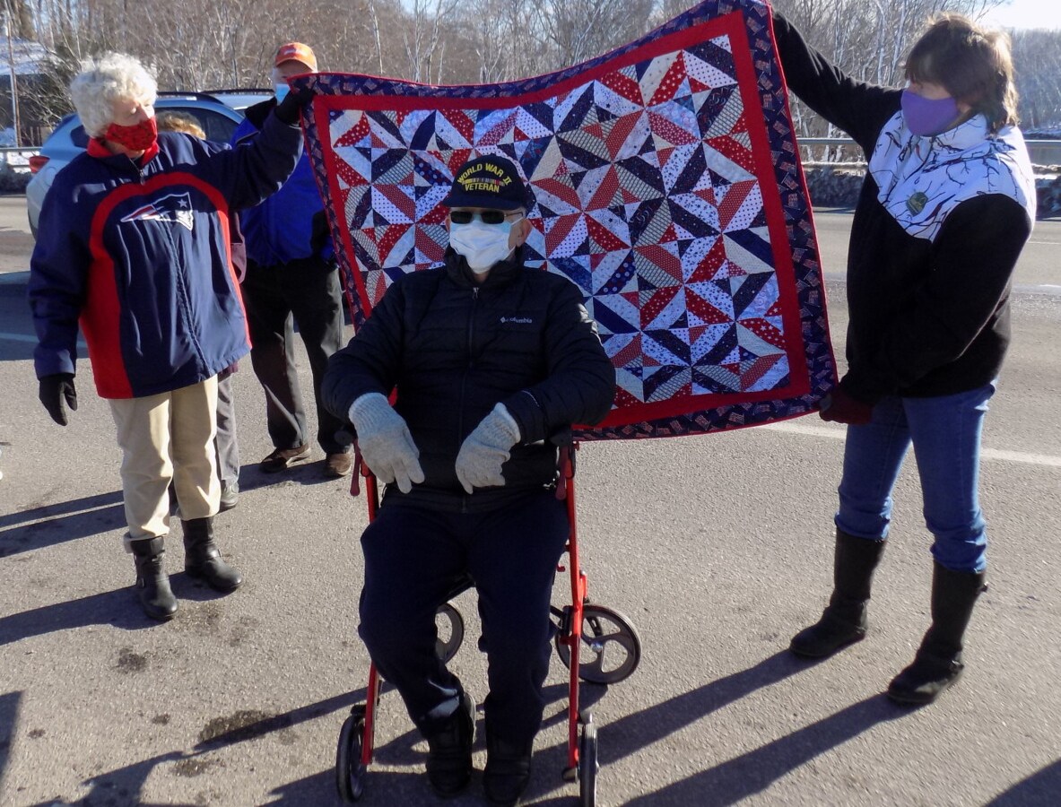 Jayne Wilcox presented a Troop of Valor quilt she made to Brimigion, the fourth she has made and the first time she met the veteran her quilt was given to.