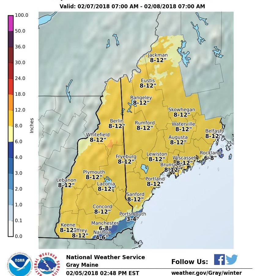 Here is a look at what we are expecting through the rest of the week, with focus on Wednesday. #nhwx #mewx pic.twitter.com/WxUf6r3WEc — NWS Gray (@NWSGray) February 6, 2018 A fast moving snow storm is expected Wednesday. It’s possible that it will turn to rain or sleet along the coast but most of Maine is […]