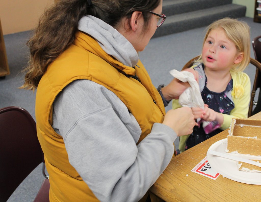 Chyla Lamp and her daughter, Elsie, build a gingerbread house Wednesday afternoon at the Norway Memorial Library. Every Wednesday, the library’s Children’s Department hosts after-school events for children. (Sun Journal photo by Matthew Daigle)