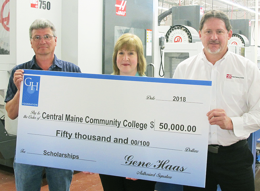 Marc Lapointe, right, a Haas CNC sales associate, presents a check for $50,000 from the Gene Haas Foundation to Michelle Hawley, acting director of the Office of Workforce and Professional Development, and Richard Bolding, chairman of the Precision Machining Technology program at Central Maine Community College in Auburn. The donation will provide scholarships to educators […]