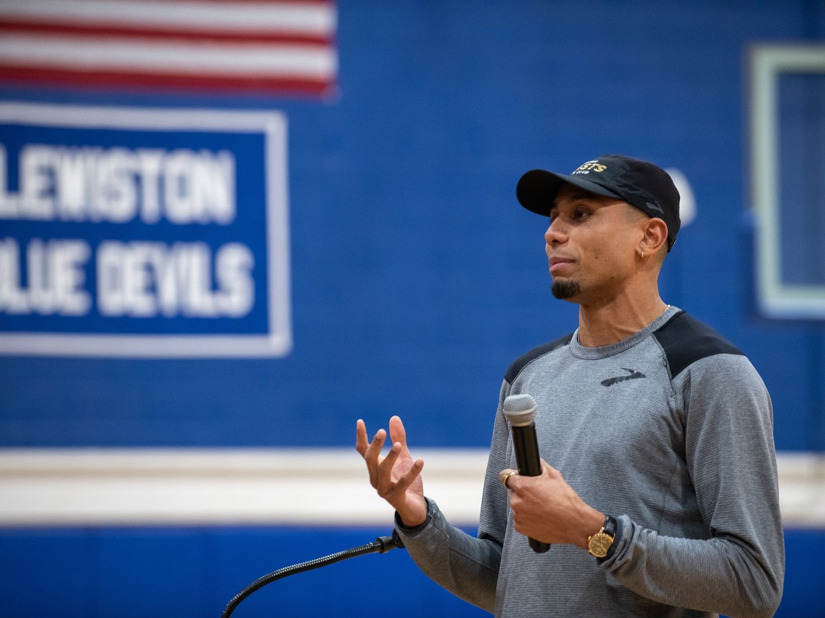 Harris, now a professional runner for the Brooks Beasts, inspires and hands out sneakers to the Lewiston High School track team.