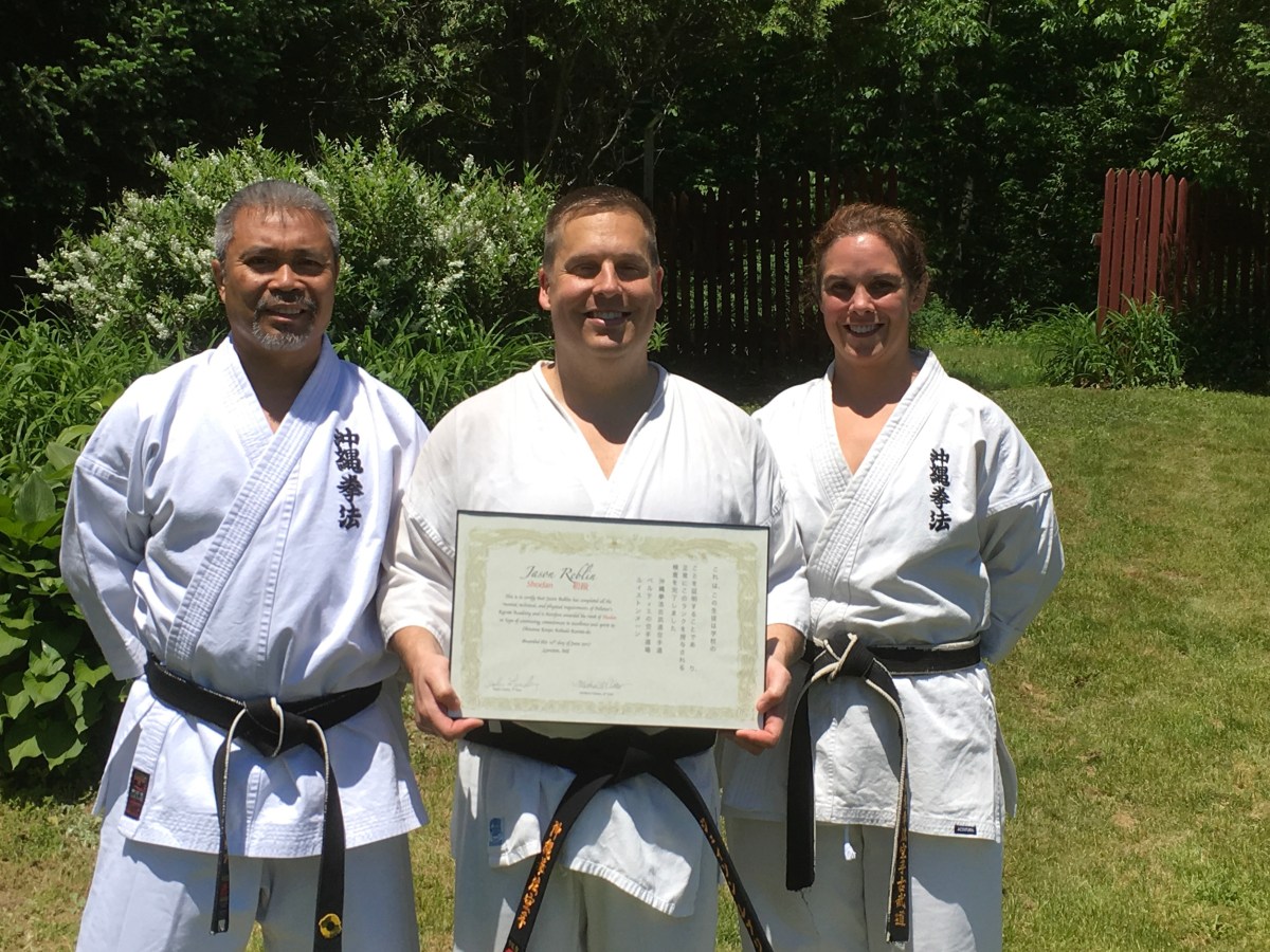LEWISTON — Pelletier’s Karate Academy congratulates Jason Reblin for earning the rank of Shodan (first degree black belt) and Noah Lampron for earning the rank of Junior Black Belt recently. Jason and Noah successfully completed tests of physical fitness, empty hand forms, traditional Okinawan weapons, and self-defense.
