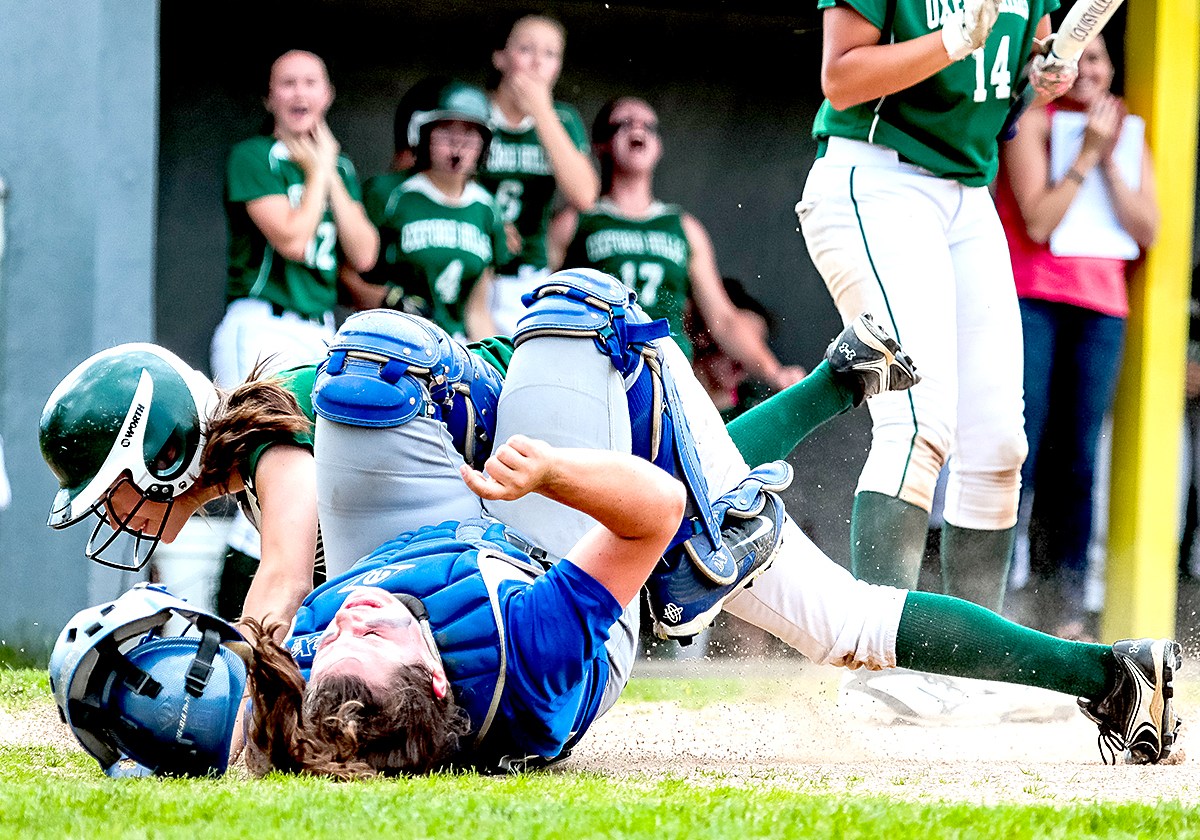 Lawrence catcher Haley Holt and Oxford Hills pinch runner Brooke Carson tangle up after Carson scored on an errant throw to first base.Lauren Merrill winds up.Oxford Hills third baseman Kenzie Kahkonen gets ready.Oxford Hills’ pitcher Lauren Merrill, center, celebrates with battery mate Anna Piirainen and Kenzie Kahkonen after the win.Oxford Hills Hannah Kenney gets tagged […]