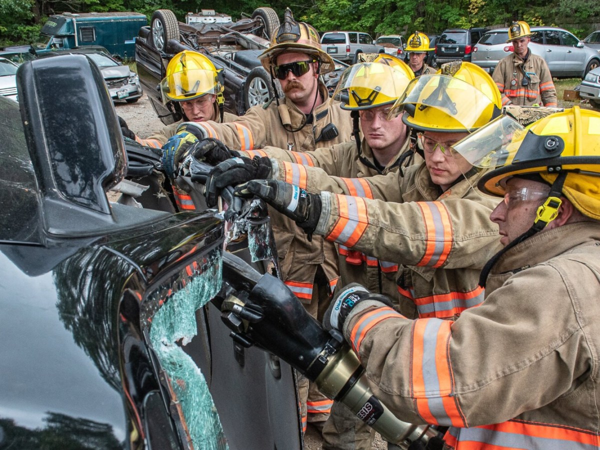 Firefighters tear apart a junk car to get familiar with their equipment.