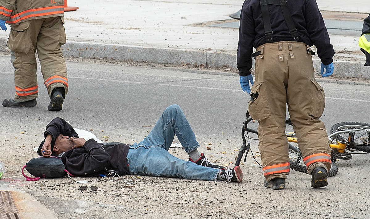 A man riding across Pine Street in Lewiston was hit by a pickup and paid the price twice.