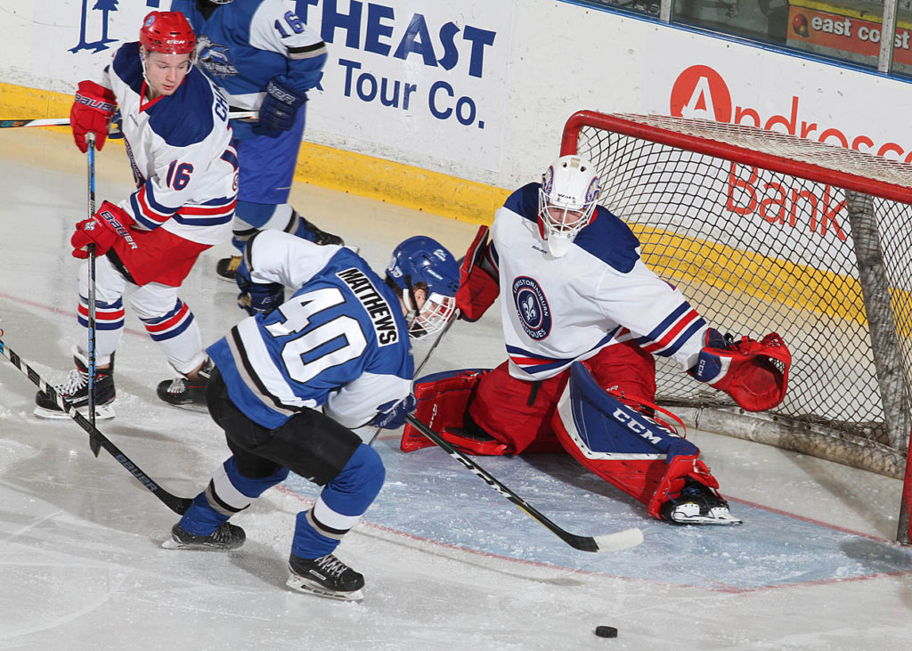 Nordiques goaltender Jason St. Pierre keeps an eye on his rebound as Avery Matthews of the Sharks looks for another shot during second period action in Lewiston on Saturday. (Ron Morin photo) LEWISTON — It was just a matter of time for the L/A Nordiques. They had a 24-7 shot advantage after one period but […]