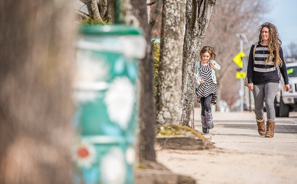 Rosalie LeBlanc, 6, skips down the sidewalk on Main Street in Norway with her mother, Rachel LeBlanc, on a recent afternoon after school. The warm temperatures have seen people shedding warm layers and adding a little spring to their steps. (Andree Kehn/Sun Journal)