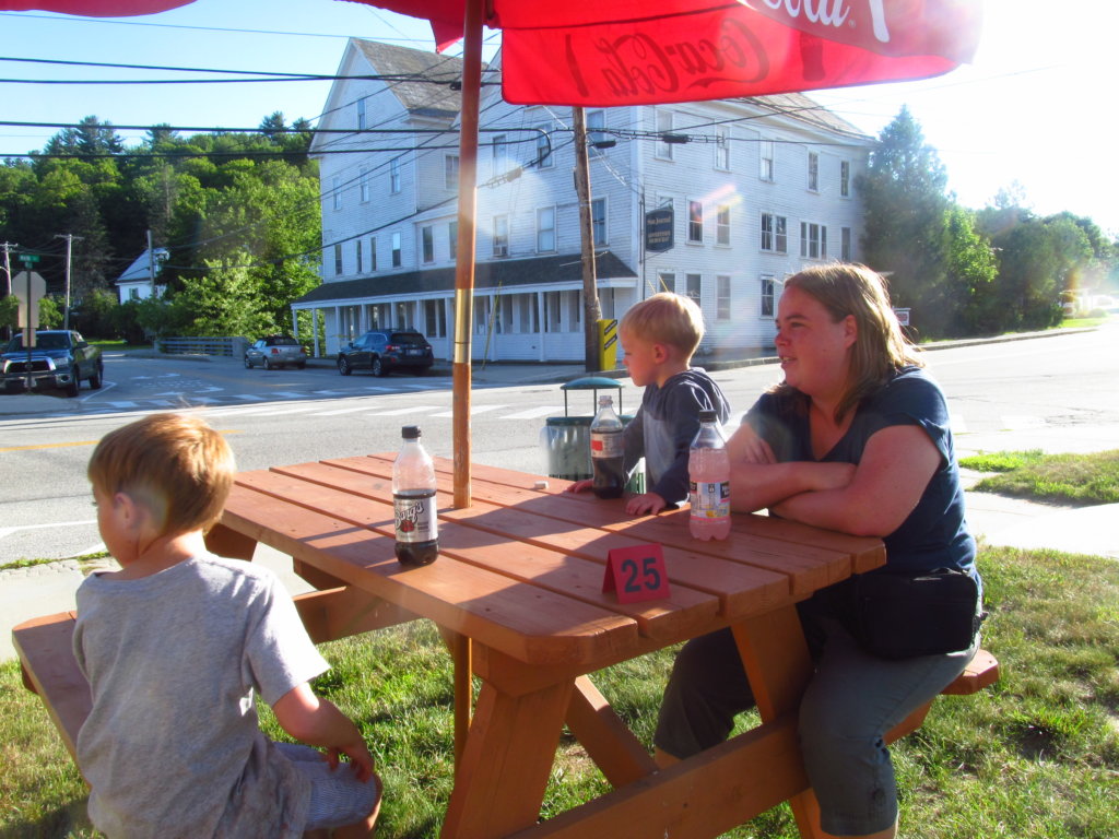 Amanda Ilsley and her sons, Nathan, center, and Bobby Ilsley, sit at a picnic table at Ari’s Pizza and Subs on Main Street on Thursday enjoying the sights and sounds of early evening. (Matthew Daigle/Sun Journal)