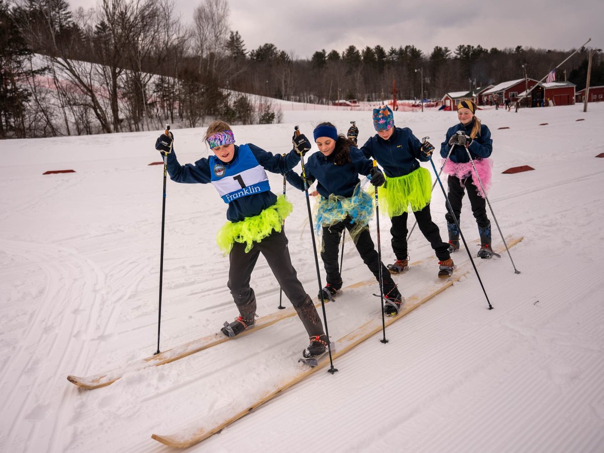 Teams of four skiers, all strapped into the same pair of gigantic wooden skis, attempt to ski as fast as they can as a unit at Titcomb Mountain’s Giant Ski Race.