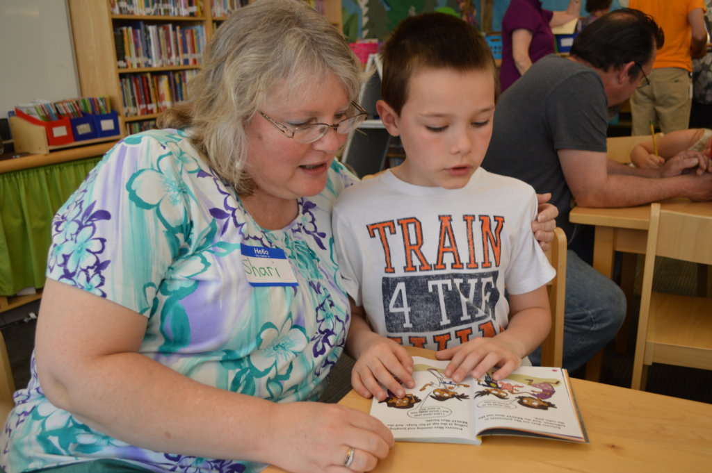 First-grader Brayden Simmins of New Vineyard reads to his “Mimi,” Shari Newcomb, of Livermore Falls during Grandparents Day on Friday at W. G. Mallett School in Farmington. More than 200 grandparents were entertained by students, played games, had lunch and took photos. (Donna M. Perry/Sun Journal)