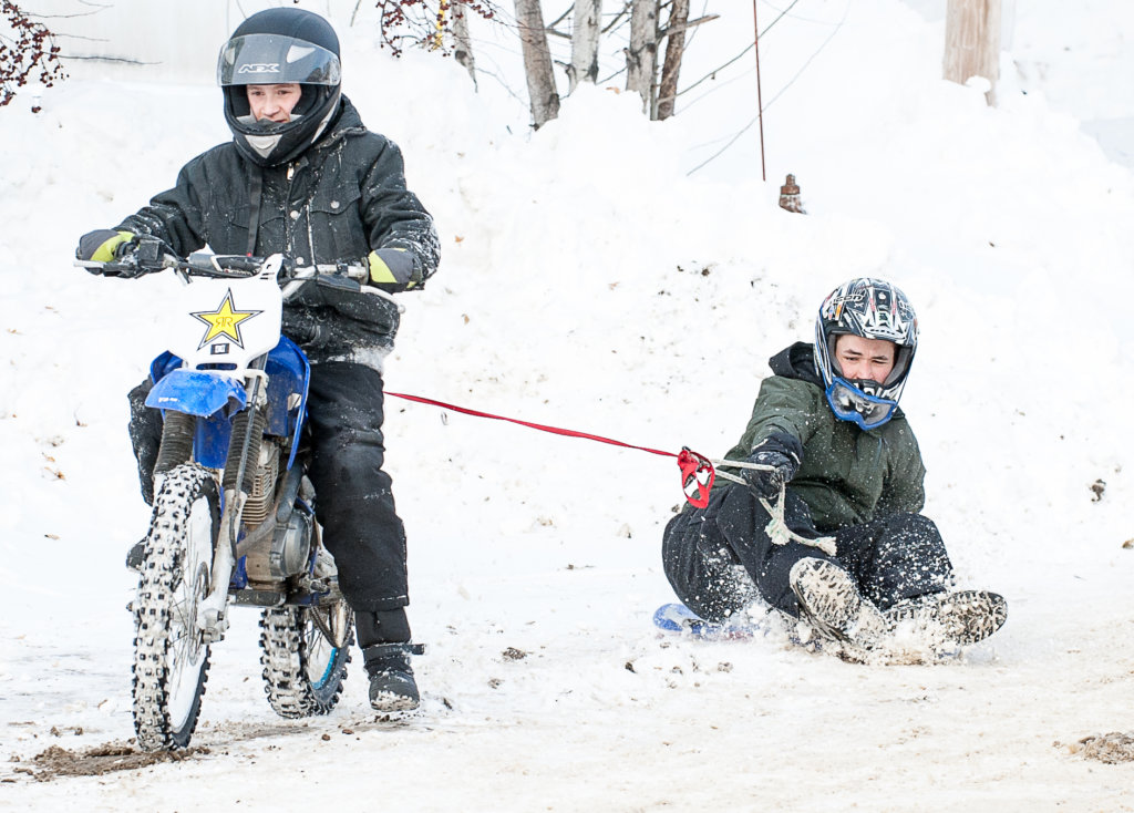 Phillip Pendexter, 15, pulls his friend Jordan Carter, 15, around their Spring Street neighborhood in Lewiston on Sunday afternoon. (Russ Dillingham/Sun Journal)
