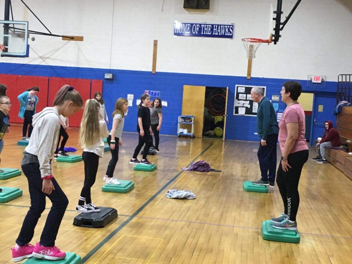 Yoga, jujitsu, aerobics instructors teaching fifth-graders at Mountain Valley Middle School.