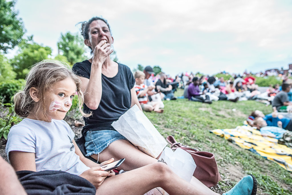 Macy Gravel, 7, and her mother, Kristen Vitale, watch “The Lion King” at Simard- Payne Memorial Park in Lewiston on Wednesday evening. The outdoor movie is the first of the Summer Fun & Films Midweek Movie Nights. All movies are free and open to the public. (Andree Kehn/Sun Journal)