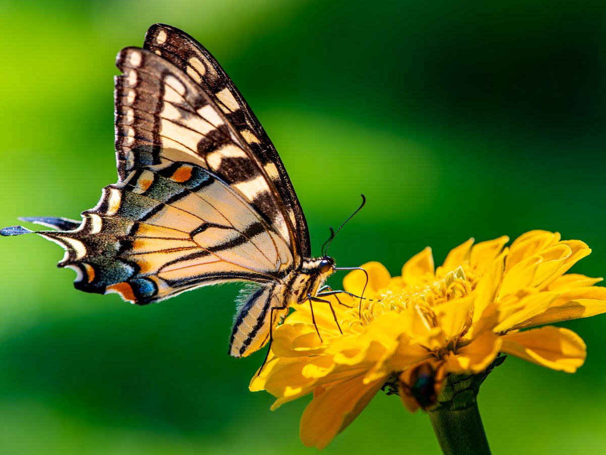 A butterfly feeds on a zinnia in a Lisbon garden Wednesday afternoon.