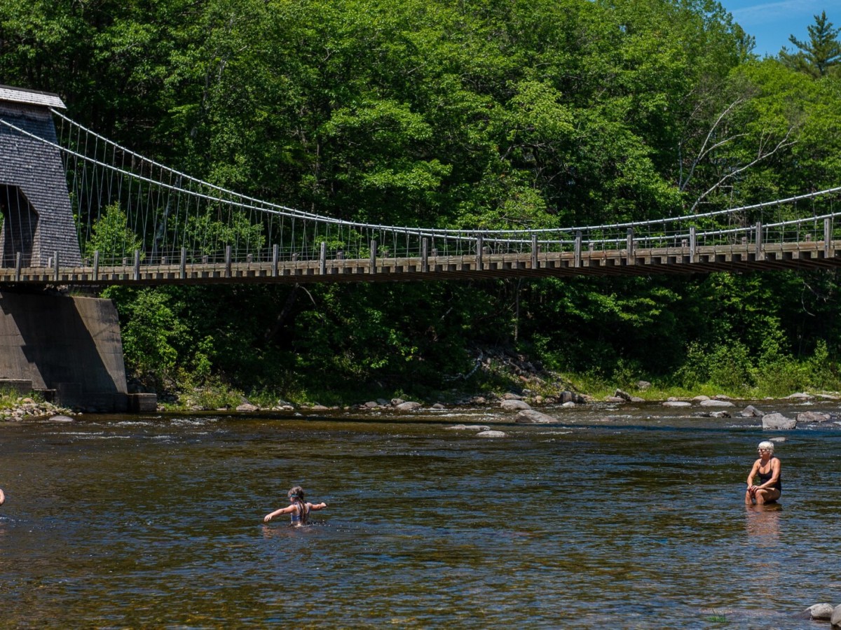 New Portland woman relaxes in the Carrabassett River as her grandchildren swim.