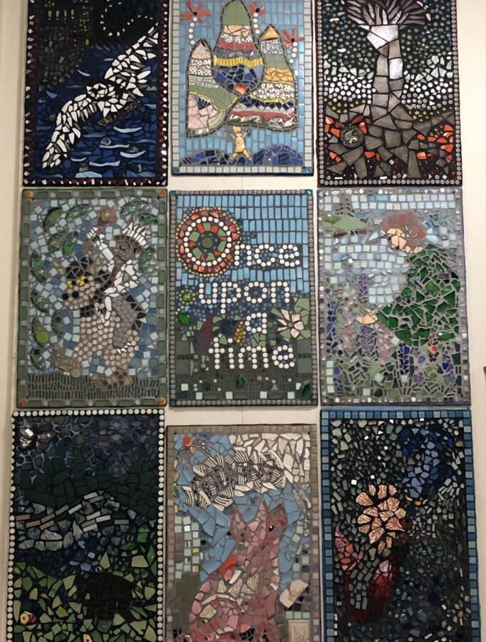 Norway Memorial Library unveils a community art mosaic project, made possible by the Maine Public Library Fund, a donation program included on the Maine Income Tax form – Form 1040ME. Twelve volunteers gathered over a period of eight months to smash colorful china and find inspiration from traditional and modern literary classics.