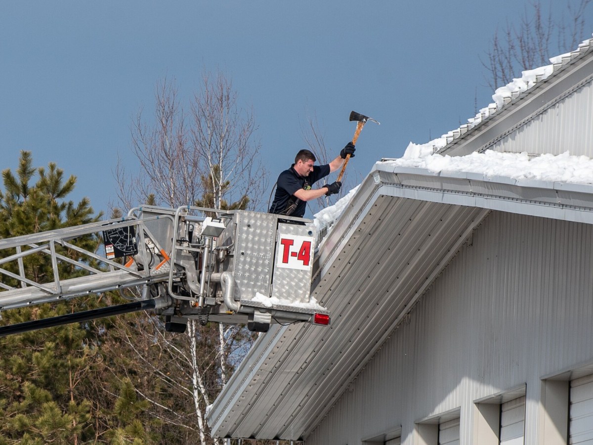 An Oxford firefighter uses the ladder truck to remove ice and snow from roof Monday morning.