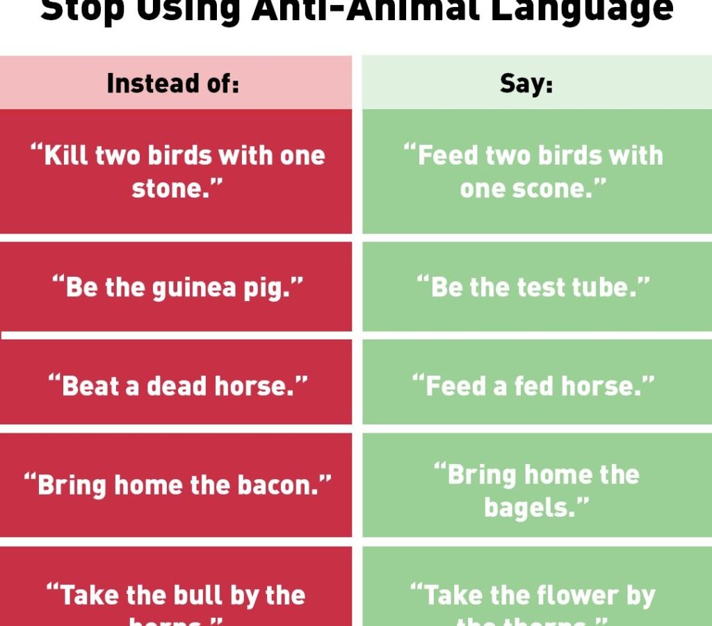 (People for the Ethical Treatment of Animals graphic) Have you ever tried to feed a fed horse? Come home with a big paycheck and thought, “Man, I really brought home the bagels today!”? Or just . . . taken the flower by the thorns? Those, according to People for the Ethical Treatment of Animals, are […]