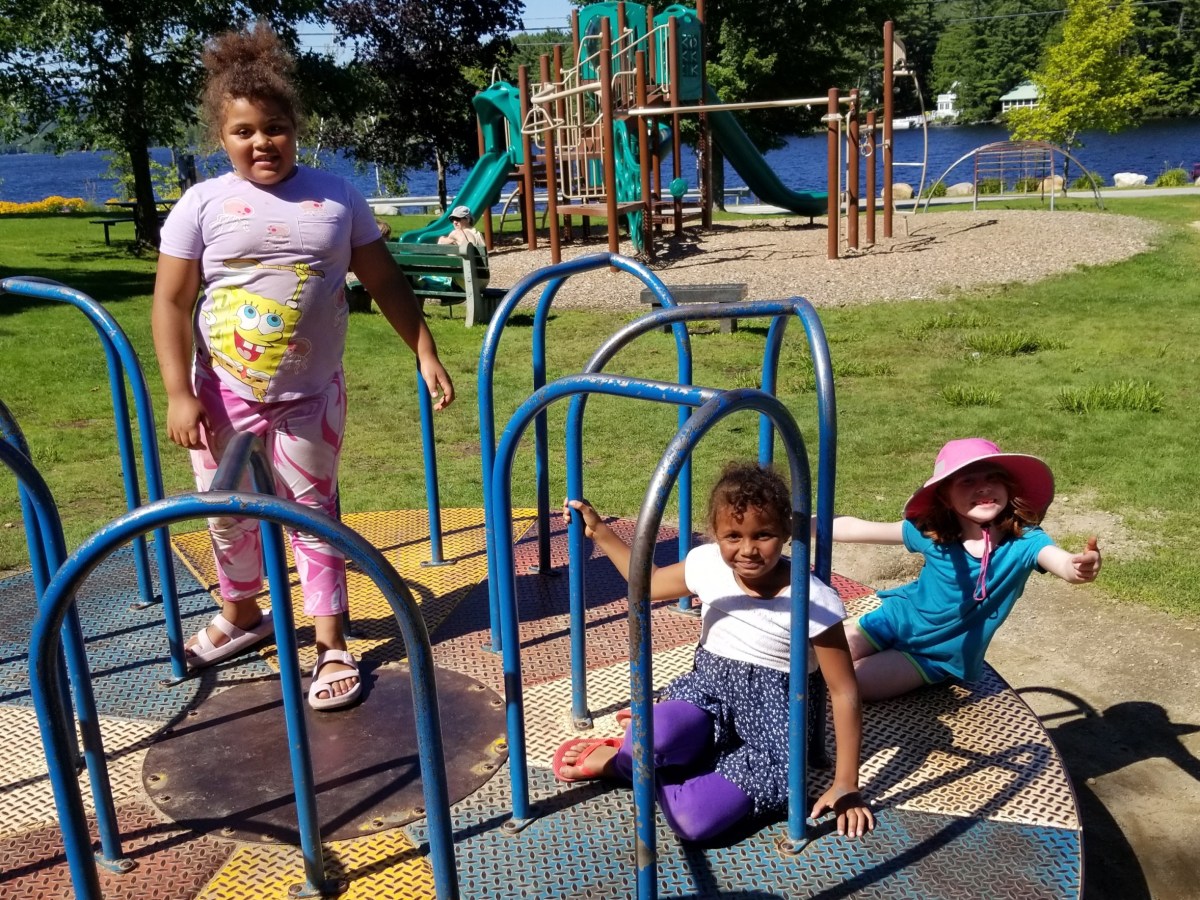 Three girls from Chesterville and Lewiston have fun on the playground equipment on Tuesday at Bass Park.