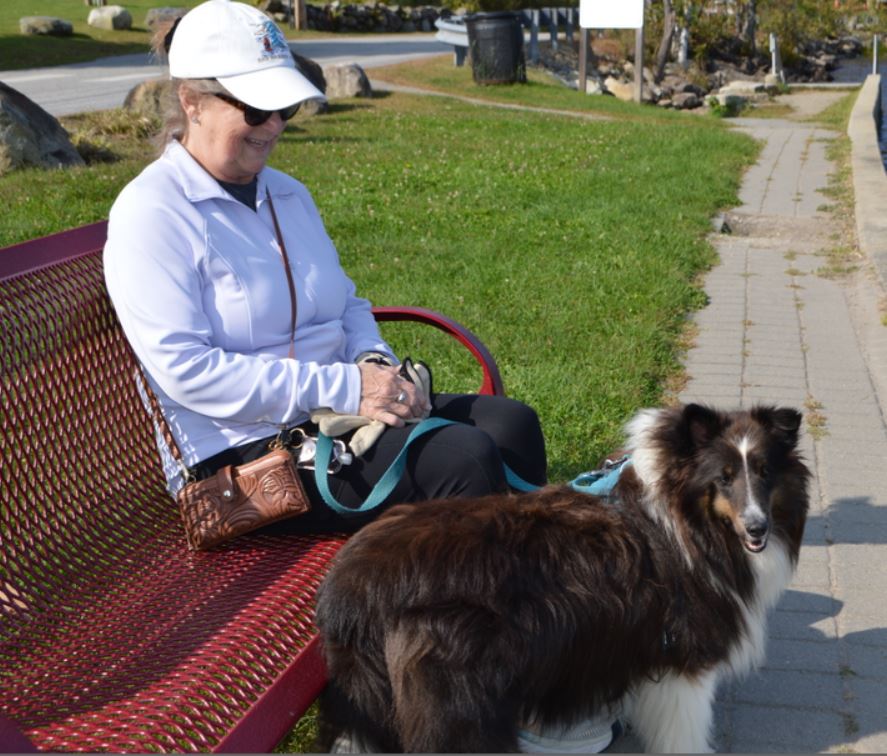 Peggy Pottle of Wilton sits on a bench on Tuesday with her dog Atticus.