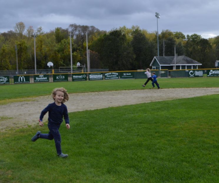 The Scoles and Hazard families play a pretend game of baseball Tuesday at Hippach Field in Farmington.