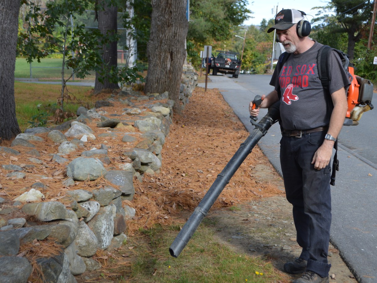 Franklin Donald, director of Wilton Parks and Recreation Department for over 30 years, uses a blower Tuesday to clean near a stone wall at Kineowatha Park.