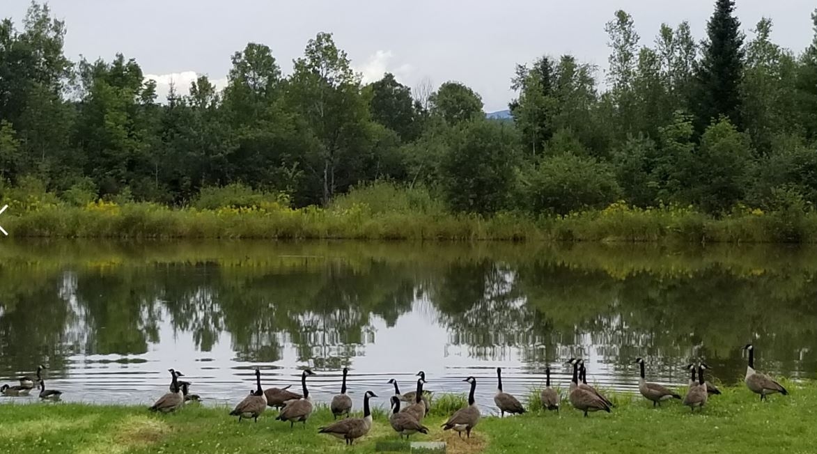 A flock of Canadian geese took its time to walk across a dirt parking lot onto grass before getting in the water Tuesday at Titcomb Mountain.