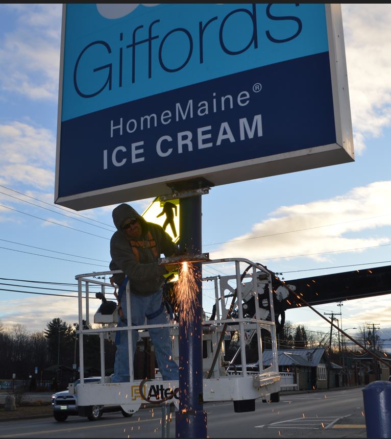 Nathan Gumprecht of Lisbon who is working for Neokraft Signs Inc. in Lewiston prepares a pole to add a new message sign at Gifford’s Ice Cream in Farmington.