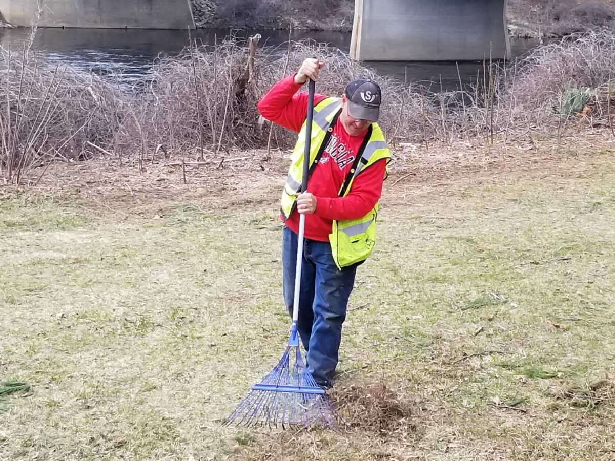 Ken Pelletier cleans up the branches, leaves and dead grass between the Androscoggin River and the gazebo in Livermore Falls.