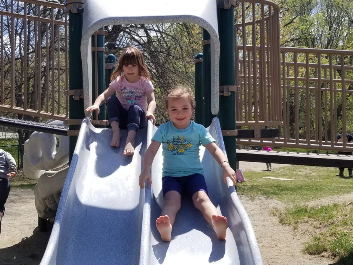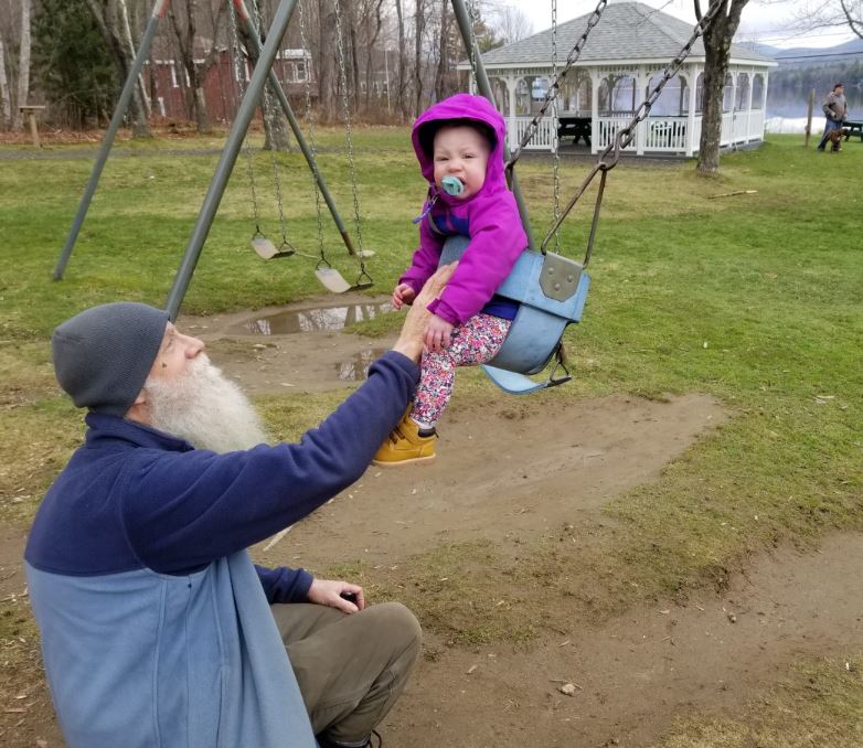 Mike Breault of Wilton pushed his young granddaughter, Quinn Fitch in a child-safe baby swing on Thursday morning at Bass Park.