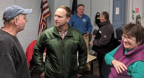 John Myrand talks with special guest, Adam Cote, clean energy consultant and co-founder/CEO of Thermal Energy Storage of Maine, after Cote’s presentation on renewable energy at the January meeting of the Androscoggin County Democratic Committee. Also pictured is Jane Pentheny, vice chairwoman of the County Committee.