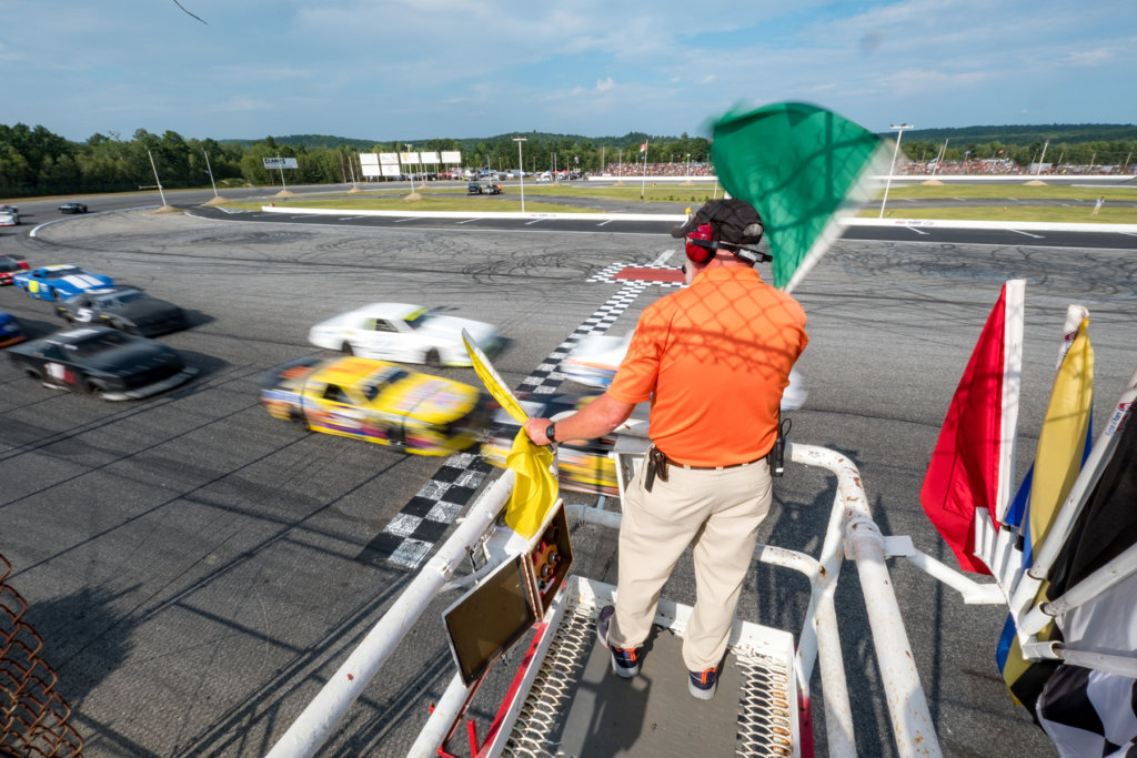 Starter Shane Carr gives the green flag to start the street stock feature race. (Brewster Burns photo)Bill Riff from Berlin, New Hampshire, watches the action from high up in the corner of the grandstand. He prefers his perch: “For $50 you gotta be able to see all the action.” (Brewster Burns photo)The top three finishers […]