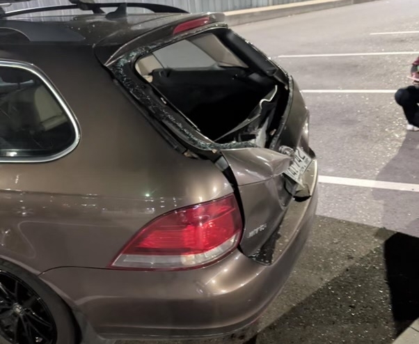 The metal rod crumpled the rear hatch of the Volkswagen Jetta parked at the Casco Bay Lines parking lot.