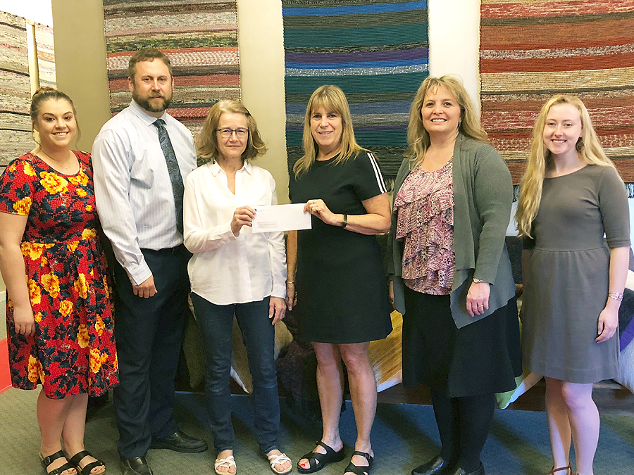 Skowhegan Savings Bank has awarded a grant to the Rangeley Friends of the Arts for student programming and scholarships. From the left are Ashley Quimby, personal banker; Christopher Farmer, vice president and regional community banker; Valerie Zapolsky, RFA president; Dora Sargent, Rangeley branch manager; Shelly Lowell, community banker; and Ariel Clinch, personal banker.