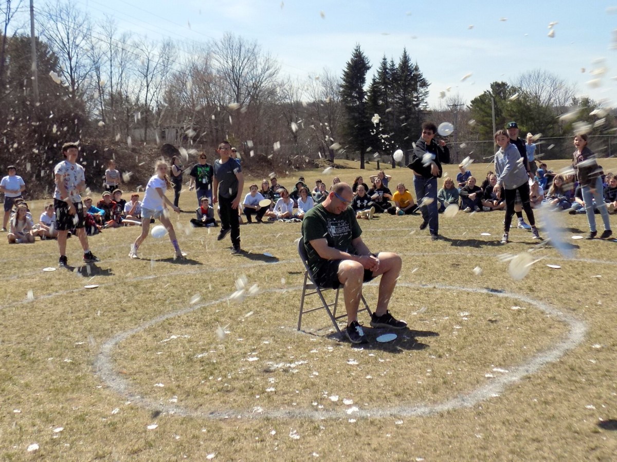 With students exceeding the fundraising goal, Spruce Mountain Middle School Principal Kristofer Targett had the top money raisers throw “pies” [actually platefuls of whipped cream] at him.