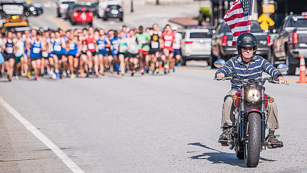 A motorcyclists leads a group of runners Sunday morning competing in the Fit Fest across Longley Memorial Bridge, from Auburn into Lewiston. Fit Fest is the first race in the Greater L-A Triple Crown 5K series. The race started and ended at Auburn’s Festival Plaza. (Andree Kehn, Sun Journal)