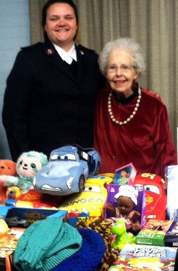 Members of several area Red Hat Society chapters donate toys to the Salvation Army Toy Drive at the Auburn Mall.