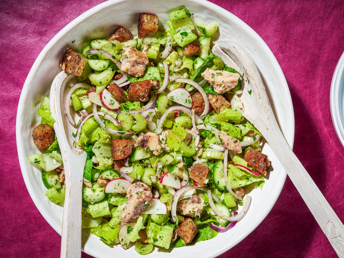 Celery, radishes, cucumbers and croutons add crunch to a salad with sardines and lots of lemon and herbs.