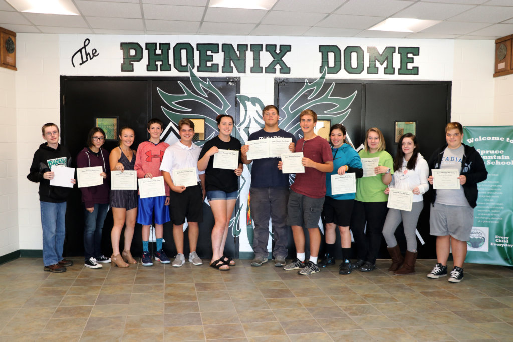 Academic awards for September were presented to students at Spruce Mountain High School in Jay. Recipients are, from left, Payton Fitch, Leeah Volterman, Julia Pomeroy, Connor Donahue, Matthew Fenlason, Jordan Mitchell, Trent Tibbetts, Owen Bryant, Savannah Corliss, Madeline Labonte, Megan Dodge and Logan Harvell.