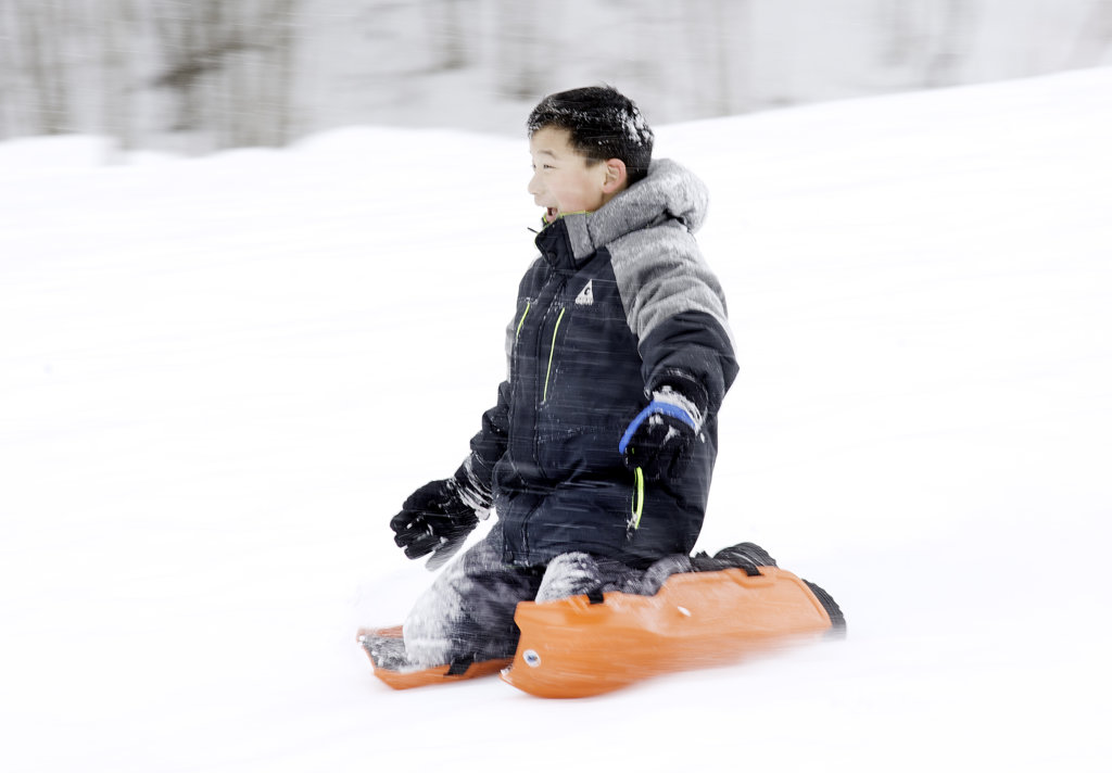 Timmy Ellingwood, 7, of Lewiston slides Tuesday on his Sled Legs at Pettengill Park in Auburn. The second-grader at Acadia Academy and his two siblings had a snow day from school. Ellingwood’s Sled Legs were a Christmas gift from his grandparents Linda and Jerry Ellingwood of Norway. (Sun Journal photo by Daryn Slover)